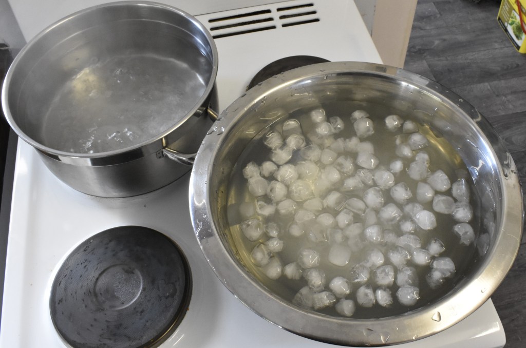Fill a large bowl with cold water and ice. Allow it to sit for a minute, and keep it close to the pot of boiling water. Less movement saves time.