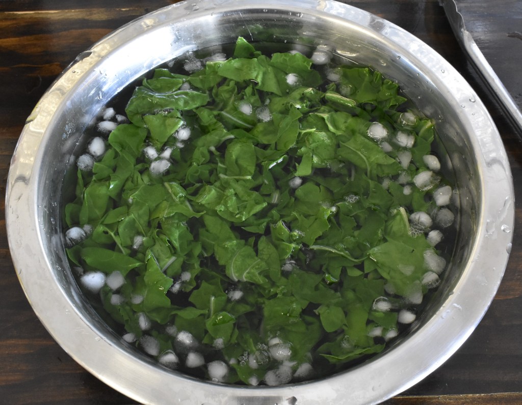 Take the green or veg you wish to blanch and add it to the pot of boiling water. For something like my silverbeet, I only need to dip it in before transferring it to the ice bath. It doesn’t take long at all. All you need to do now is to dunk the greens into the boiling water. Once your vegetables are in the ice bath, stir them, ensuring they are submerged. Allow them to sit for a while so they can cool properly.
