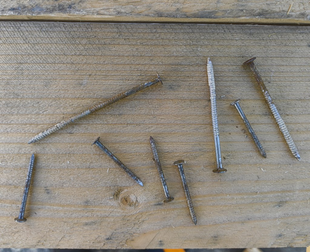 When the last nail was removed, I stacked all the timber in groups according to size, measured, and counted them so I had a clear idea of how much I had and what sizes there were. The nails I removed were sorted into ones that were still straight and usable and those that were as crooked as a dog’s back leg.