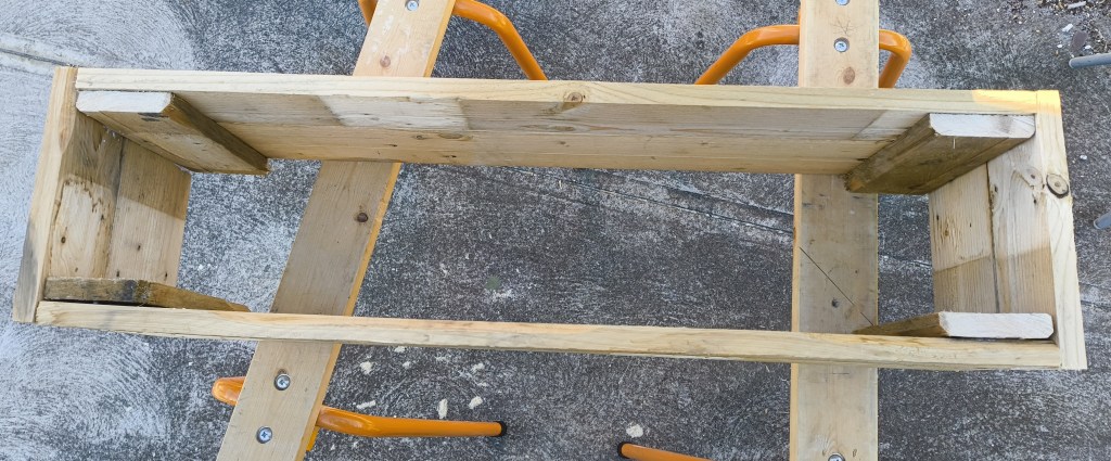 I applied a bit of wood glue to the 240mm piece and sat it facing up on the workbench, or in my case, saw horse. I then positioned one of the 900mm long boards on top, ensuring they were square and nailed them together.