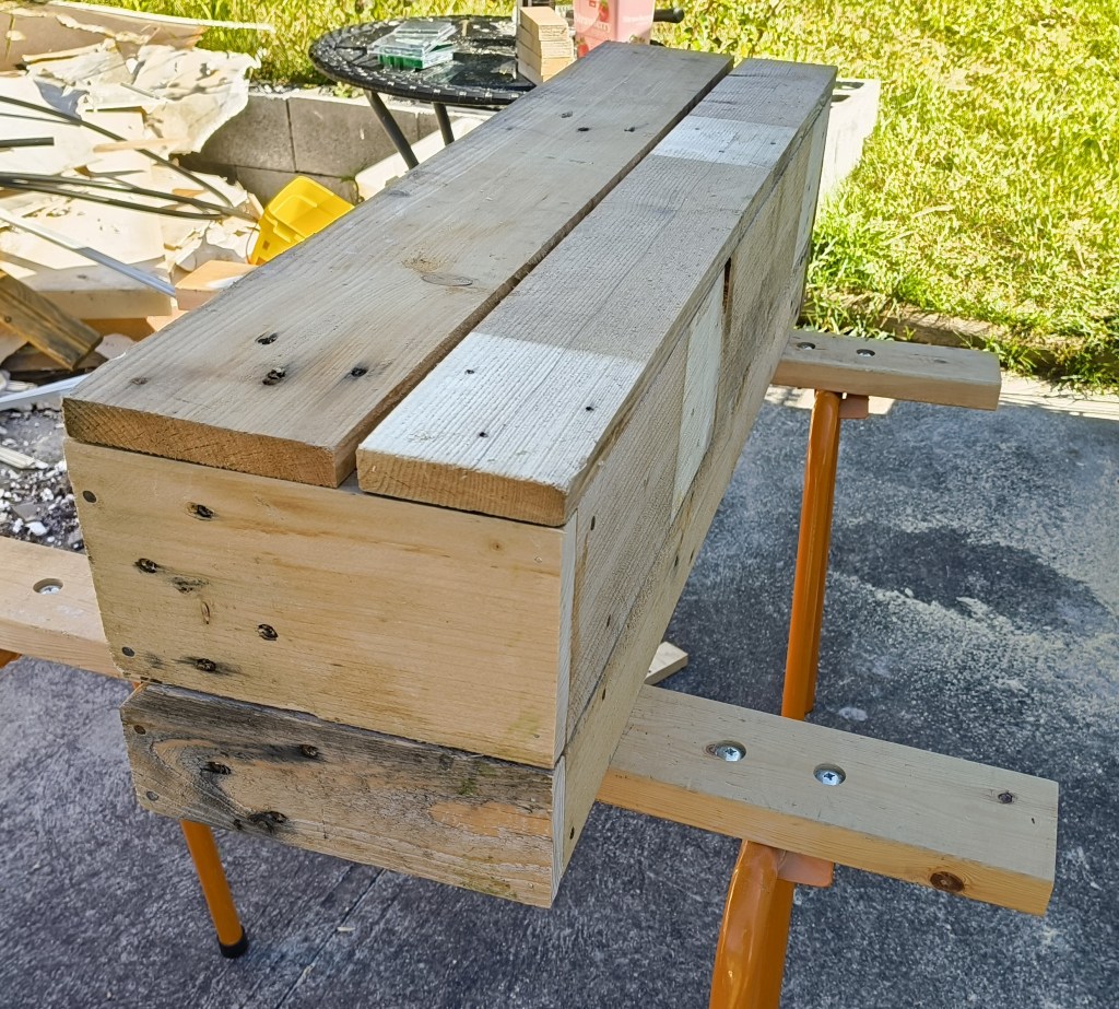 When the first two boards are nailed together, add the second 900mm board and then add another 240mm piece at the opposite end. In the end, you should have something that looks a little similar to this.