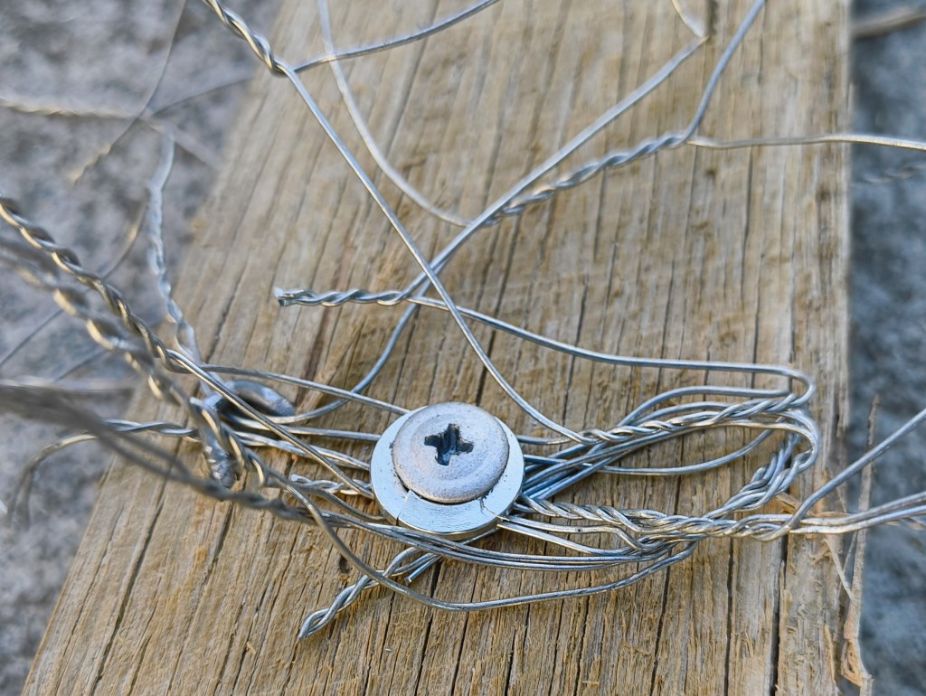 - Now that the wire has been cut to the desired length. Pick up the wire and timber so they are standing and arrange the wire to create a circle, keeping the end bit of wire on the outside. Position the free end of the wire over the timber’s outside. When you are happy with the positioning, lay it back down with the end of the wire facing up.