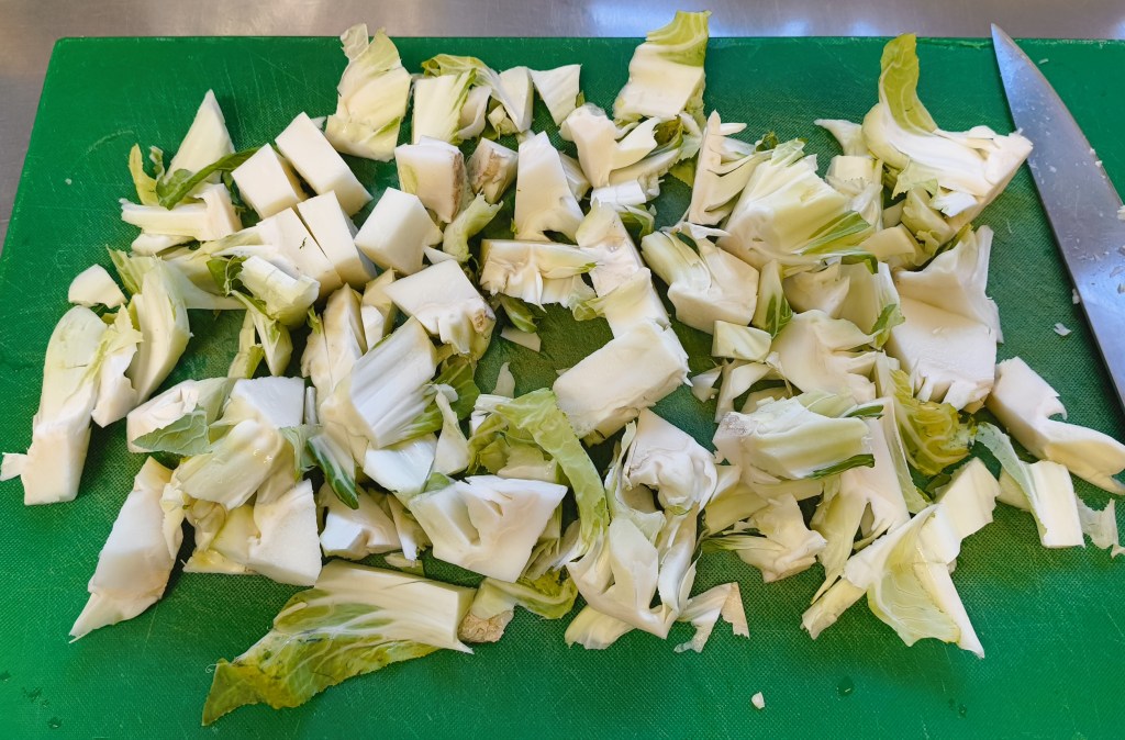 Regardless of the ingredients, if you add something to a compost heap, chop it, cut it, or shred it. Smaller items will be decomposed much quicker. Whenever I have vegetable offcuts that I intend to compost, I will chop them up so they are smaller. As you can see in the pictures below, the cauliflower stalks on the left will break down much quicker than they would in their original size.