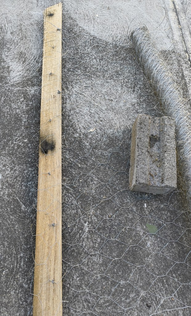 - Line the chicken wire up with the 10cm mark and wrap one end of the chicken wire around the timber.