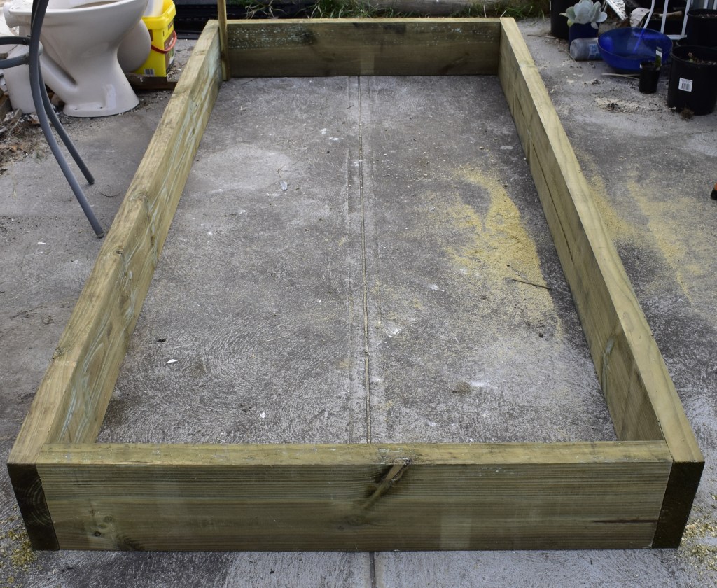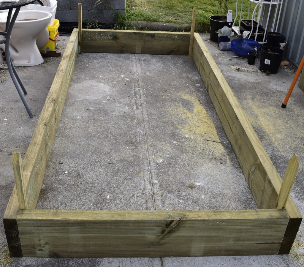 Garden sleepers are not cheap. Yes, you can find some that are more affordable than others, but if you’re making something on a budget that requires them, you may need to save up some money before starting a project like this. The ones I purchased were 200x50x2400mm, and they ended up costing $22. They were one of the cheapest ones I could find that still looked how I wanted. I used three of them to make this one bed, which ended up costing a total of $66. While this isn’t a bad price for one bed, I will need at least another nine of these sleepers to do what I have planned, and then I will need to fill them, which will further increase the cost. I will be buying, making and filling them one at a time in an attempt to make it easier financially. Hopefully, I can use my compost heaps to help fill them instead of going to the landscaping supply store for soil and compost.