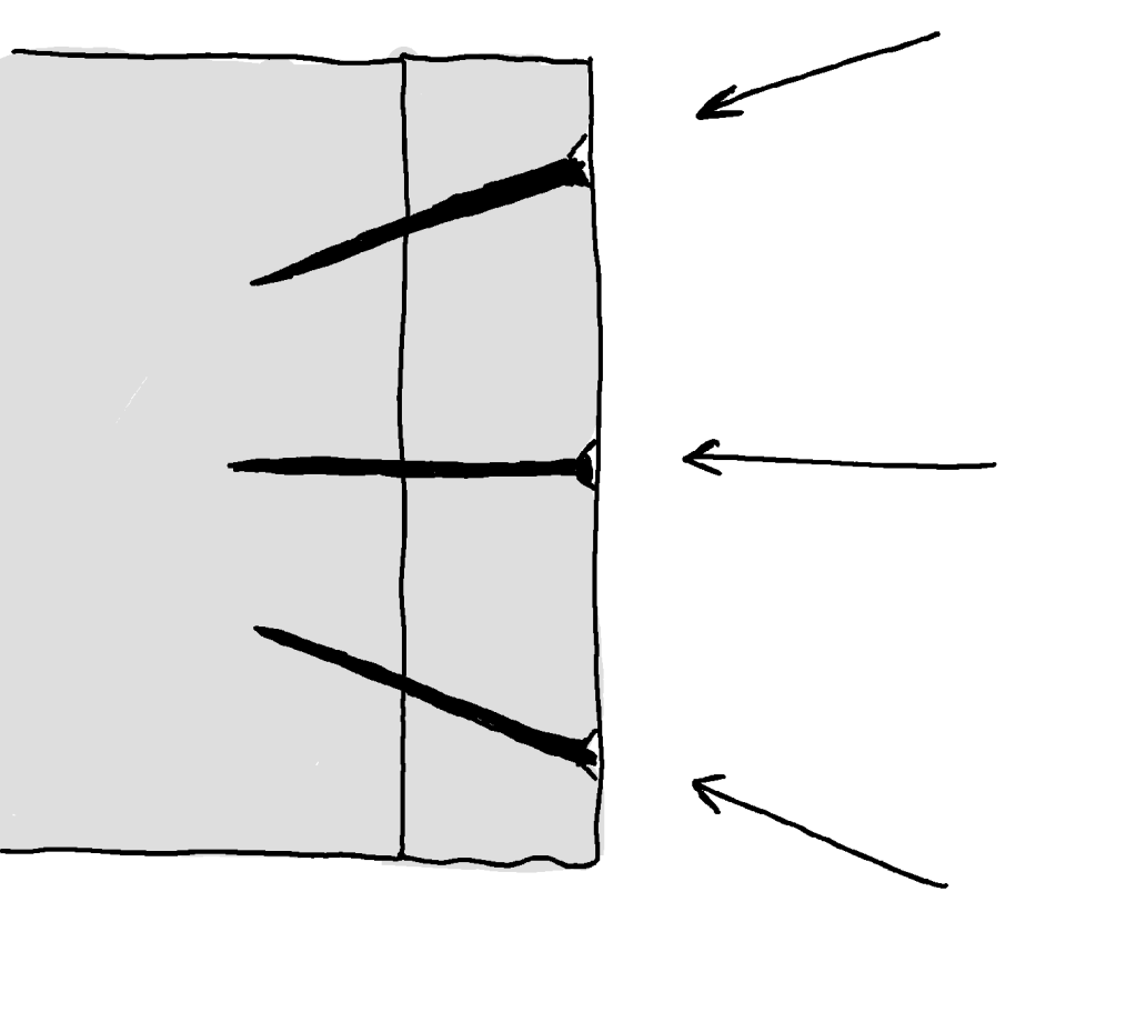 I set the sleepers up together on the ground like they would be as a finished product. I then went around each corner and drilled small pilot holes for the nails. I used three nails per join. If you want more, you will need more nails than the 12 listed above. It pays to ensure each pilot hole is centred with the end sleeper to which you are attaching the side. You don’t want any nails to be too close to the edges of the timber as you risk splitting them or having the end of the nail come out the side of the sleepers. Out of the three nails at each corner, drill the top and bottom pilot holes at an angle so that when they will help secure the join and give the frame a little more strength. Below is an illustration explaining what I mean by the angle of the nails.