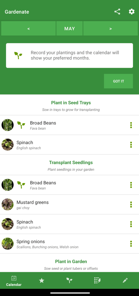This is a basic, easy-to-use little app that ticks a lot of boxes. To begin with, its location settings are the most accurate I have seen out of the apps I have looked at today. This means that the growing recommendation calendar is also bang on regarding dates of when you can sow or transplant your plants. Other than the My Garden tab it doesn’t have any method of organising the plants you have marked as sown, other than the image of a little plant next to it. It would be nice if it allowed my to group everything by what bed I have sown or planted in in. It has an impressive catalogue of plants available, of course. The option to add more is available if you wish. But I haven’t had to yet.