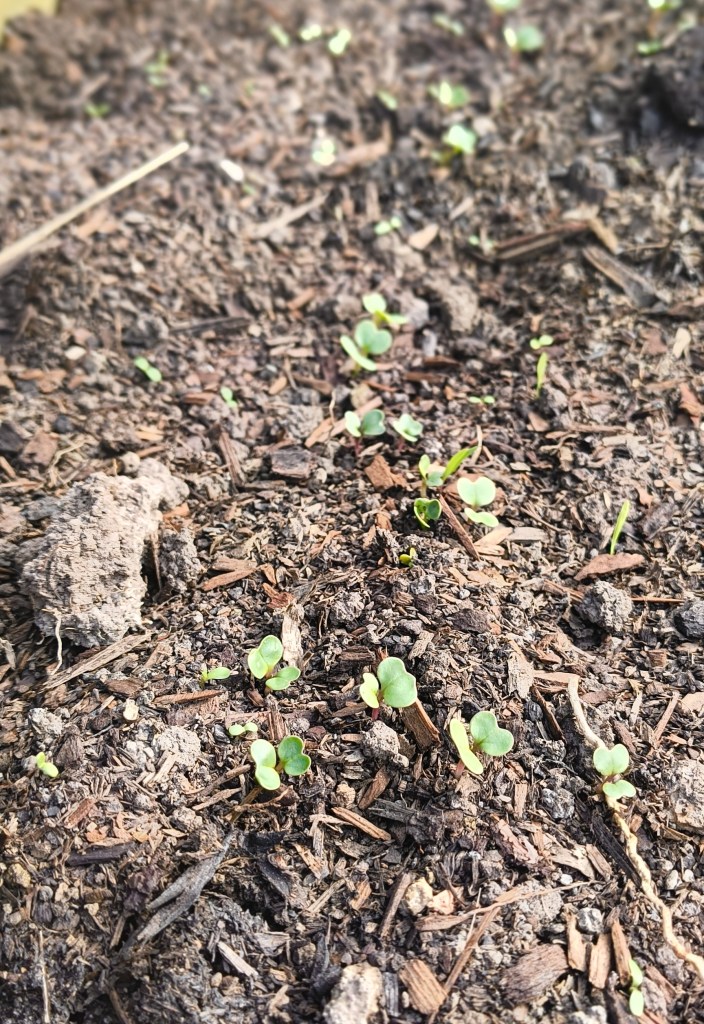I was also able to get out and sow some seeds into the new timber garden bed. Sitting at roughly 8×3 feet, give or take a little. I chose this size because it allows me to have enough space for three rows down the length of the bed. I thought I might try to loosely follow the idea of square-foot gardening and allow each row to take up a foot. At the very least, I figured it might help me keep track of the spacing of my plants.
