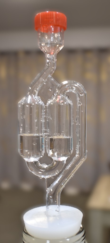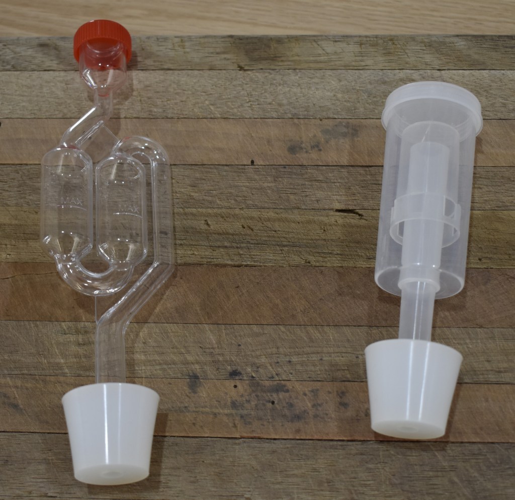 - Regarding airlocks. Previously, when I’ve made mead or beer, I have always used what’s called an s-bend airlock, which is basically two air pockets that you fill with water that creates the airtight seal that allows gasses to escape but prevents anything from coming in. I tried using a different type of airlock in my recent failed attempt. This one has a small cap inside a chamber that allows gasses to build up underneath it. As the gasses reach a certain point, they lift the cap above the water and let the gasses escape. Since it was my first time using one of these airlocks, I paid close attention to them. I noticed that water was drawn back into the demijohn as the gasses escaped, eventually breaking the airtight seal. I’m unsure if I had a faulty airlock or was using it incorrectly. I have seen them used by others successfully, so it’s probably just me. But I went out and purchased some s-bends that I am much more familiar with, just in case.