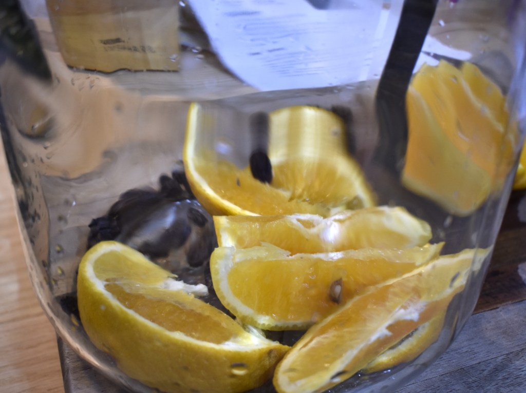 - Place the orange wedges and raisins in the demijohn. You can also add any optional fruits or herbs at this stage. I made a second mead using the same recipe, but I added some raspberries, blueberries and blackberries.